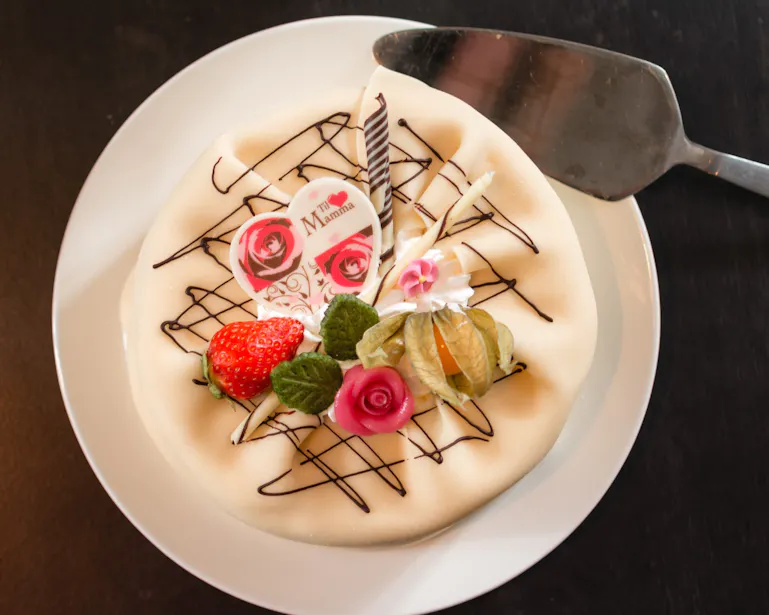 Kaken består av sukkerbrødbunn, som vi bakeri selv. Den fyller vi med 2 lag fløtekrem og jordbærsyltetøy. Så trekker vi den med marsipan og pynter den med roser og et skilt med Til Mamma.